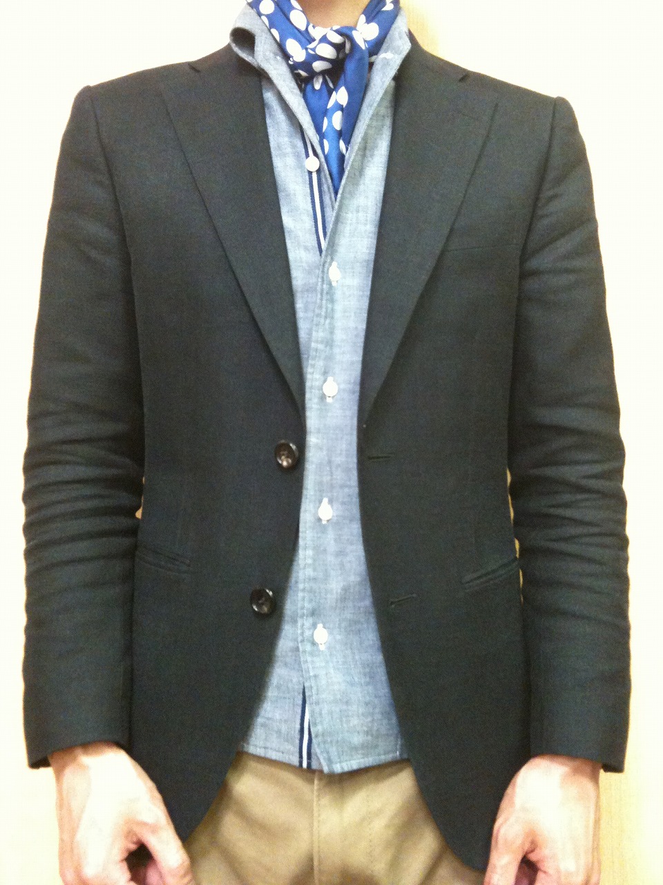 雰囲気的には、細め3つボタンのような形でVゾーンが浅く、クラシックというより、デザイン性に富んでいるスタイルなので、細い方に特に似合います。