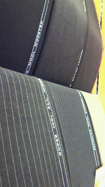 着地生地というのは、「1着分の生地」という意味で、実際1着のスーツを作るために必要な生地を3m程の長さにカットし、展示しています。