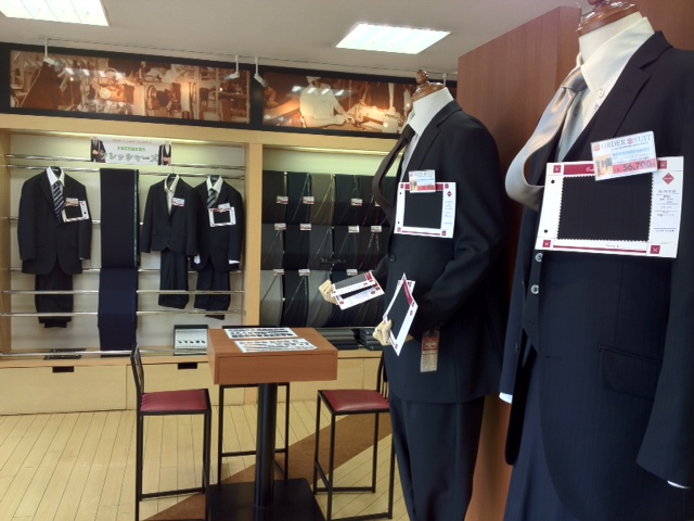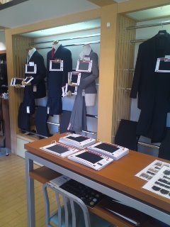 いろいろな新作スーツをみていただこうと、オーソドックスなものからちょっとクセのあるデザインまで、所狭しと狭い店内に配置しました。